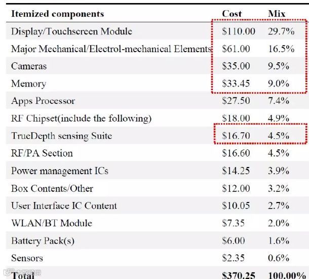 1) iphone X成本拆分:根据IHS数据,iPhone X物料成本合计370.25美元,其中屏幕、结构件、摄像头(包含3D摄像头)、存储器占据了主要的成本,合计比例高达69.2%。