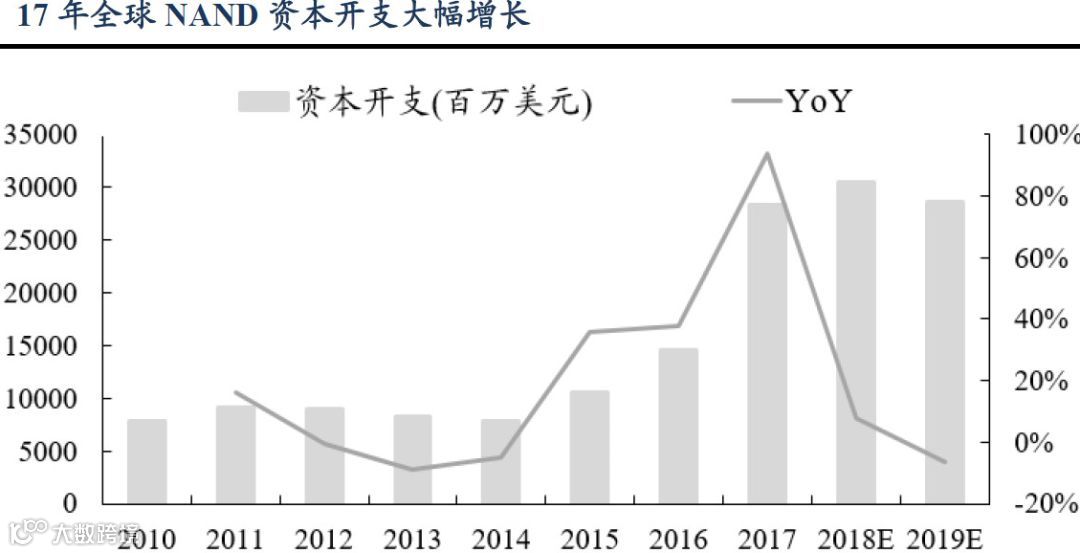 NAND Flash市场集中度也非常高,17年东芝/西数、三星、美光、海力士占据了全球NAND市场98%的份额。近几年NAND Flash的资本开支增长幅度远远快于DRAM,15、16年就分别有36%、38%的增速,2017年更是高达283亿美元,同比增长94%,并且在18、19年都维持较高规模。因此,相比于DRAM,NAND Flash的供需缺口更快得到填补。三星在Fab12、16、Line17、西安和Pyeongtaek厂都有NAND产线,新增产能主要由Pyeongtaek和西安厂提供。Pyeongtaek厂的NAND 产能从17年二季度开出后持续提升,我们预计18年底达到90K/月;17年三星投资70亿美元扩产西安厂,我们预计19年二季度将有新产能释放。19年三星晶圆年产能将达到560万片。东芝/西数的NAND Flash产能由Fab2-6提供,17年主要是Fab 2产能提升,新建的Fab 6工厂18年三季度左右完工,我们预计四季度开始产能能够释放,东芝/西数19年晶圆年产能有望达到628万片。海力士的NAND产线有M11、12和14,M14产线17年三季度开始释放产能,18年底我们预计产能将达到50K/月,19年海力士晶圆总年产能有望达到233万片。另外,从工艺制程的转换对NAND Flash产能增长的贡献更大。17年各大部分产线完成了2D NAND向3D NAND制程的转换,目前3D NAND产能占比在74%左右,预计年底将达到89%。同时,在3D NAND制程中,也细分为32/36Layer、48Layer、64/72Layer和更高的96Layer,64/72Layer已经占据较高比例,近期西数宣布96Layer的3D NAND已经开始发货。以64Layer 3D NAND为例,每片Wafer产出的256GB的Die的数量大约780颗,是32Layer同等容量产出量的两倍多,与1y nm的2D NAND相比,不仅单颗Die容量翻倍,产出也同比增加了26%。