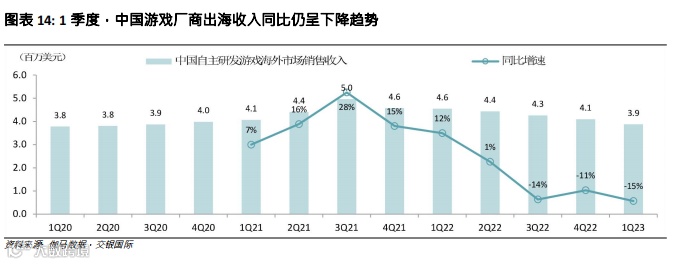 今年1季度,中国游戏厂商出海收入同比仍呈下降趋势,绝对值降至2020年1季度水平,我们预计2季度趋势也将一致。3季度起,海外恢复常态运营满1年,受季节拉动,预计收入或将同比恢复正增长趋势。