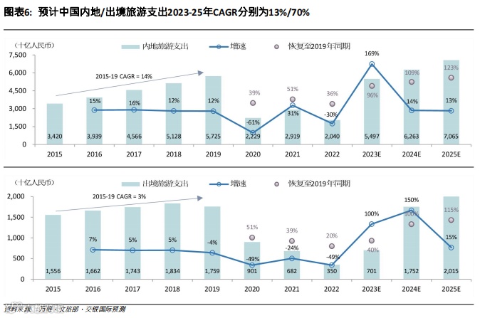 预计2023年内地/出境旅游支出恢复至2019年的96%/40%。我们预计2023年内地旅游支出恢复至2019年的96%,同比增169%。预计出境旅游支出同比增100%,恢复至2019年的40%,主要受到出境航班等供给端的限制。
