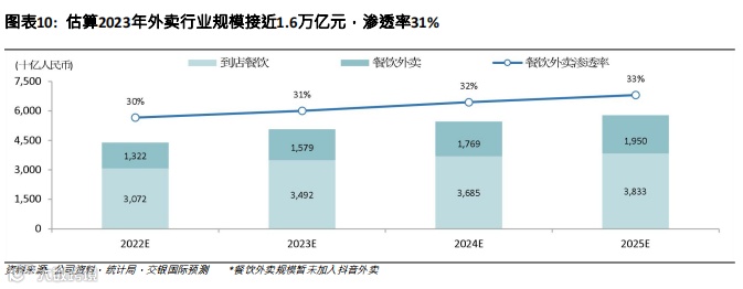 估计2023年餐饮外卖行业规模达到1.6万亿元,增速19%,餐饮渗透率31%,2022-25年复合增速14%,规模将达到2万亿元。