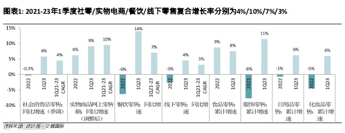 根据统计局披露社零数据, 2023年1季度线上消费及线下餐饮消费明显恢复,线下零售增长相对较慢。我们按2年复合增长率来看,线上消费增长趋势仍好于线下。分品类来看,服饰消费同比恢复11%增长,日用品/化妆品也已恢复正增长,但相比于餐饮消费,恢复仍需时间。1季度餐饮行业虽受春节假期等影响其增速,但恢复速度已快于其他消费,我们认为2季度餐饮消费增长将继续加速,2年复合增长率应好于1季度。