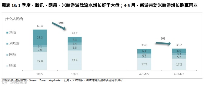 4-5月,随着新游加速上线,手游大盘同比企稳,米哈游《崩坏:星穹铁道》上线后表现亮眼,带动其内地流水跑赢同业。6月起新游仍将密集上线,预计将成为后续行业流水增长的主要动力。