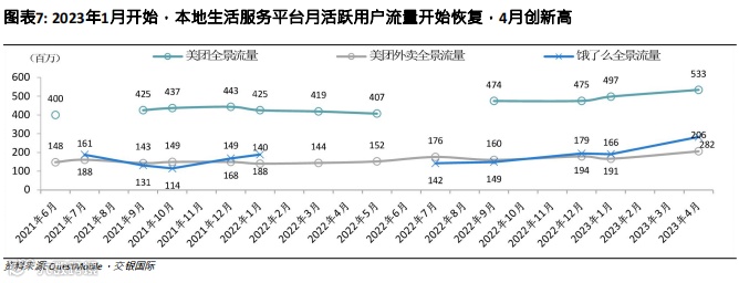 自2023年1月线下活动逐渐恢复,我们看到本地生活服务主要平台1月活跃用户(全景流量,含小程序)较去年同期增18%,较去年下半年也有2000万+的用户回流,4月进一步提升,美团全景流量较1月涨幅超过3500万,达到5.3亿。外卖服务去年12月受疫情影响冲高,1月因春节返乡等因素,用户数有所回落,但仍然相比去年同期有1000万用户的净增,4月趋势同美团APP流量走势一致,较1月涨4000万用户,创历史新高。