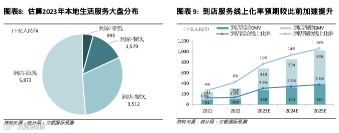 行业规模较去年预测翻倍。我们维持此前本地生活服务行业空间的估算逻辑,2023年行业总规模约11万亿元,同比增13%,其中,到家服务约2万亿元,到店服务约9万亿元。到店服务线上规模在线下活动恢复常态,以及抖音进入和美团加大投入策略的拉动下,较此前估算翻倍提升,到店餐饮线上化渗透率由此前预期的9%提升至11%,到店综合业务由2%提升至4.6%,即使在我们上调线上规模的前提下,线上化渗透率相比电商(30%)/OTA(50%)仍有较大提升空间。