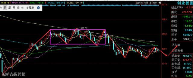 创业板今天走势明显弱于主板,今天的下跌几乎回吐了昨天的全部涨幅,最主要还是上方的压力太大。前期我反复提示过1825附近的压力是三重重要压力重叠,这个位置一旦突破,行情将真正开启,目前市场资金明显还没有做好这个准备,所以大家耐心等待。