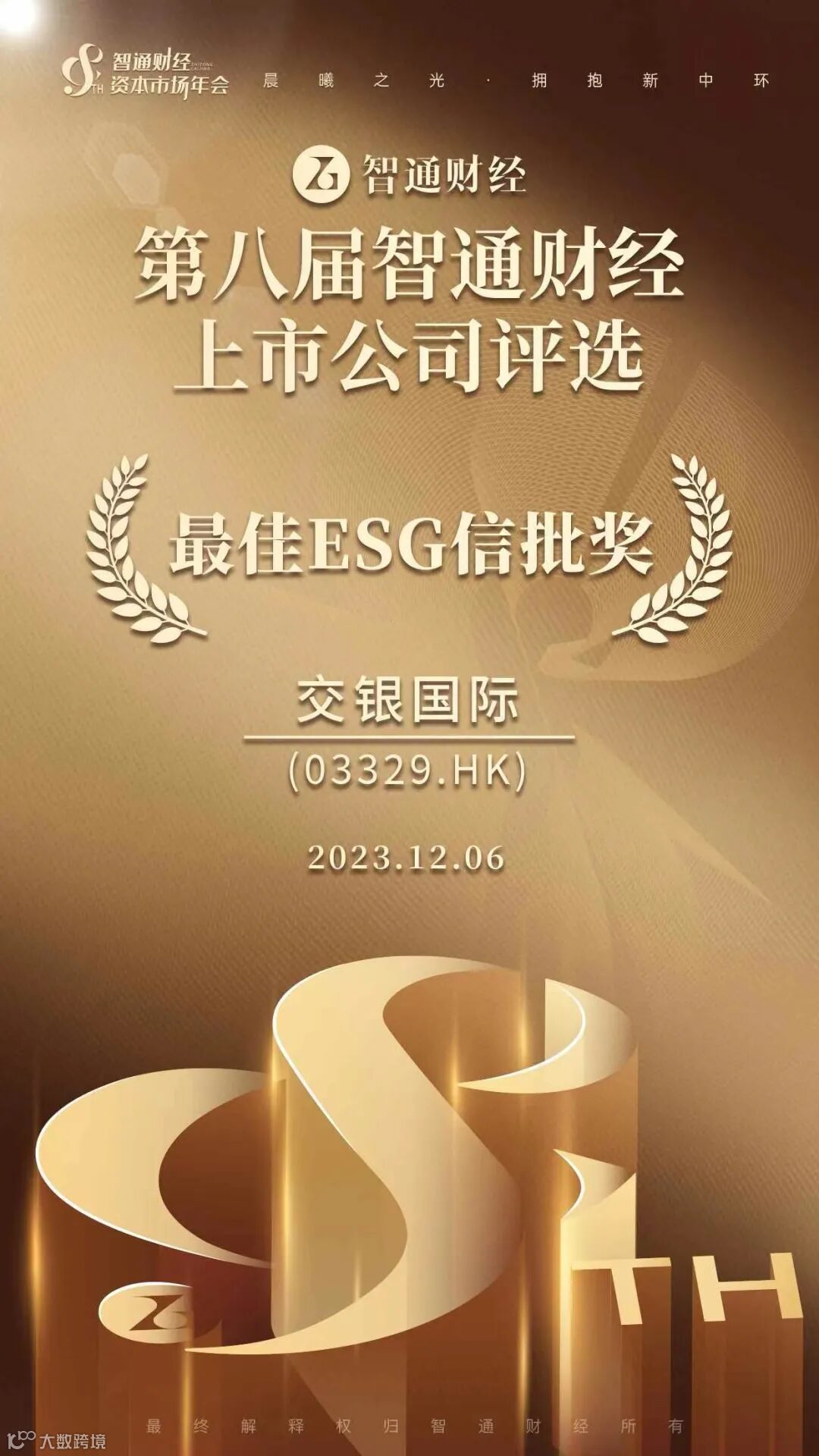 12月6日,第八届智通财经资本市场年会暨上市公司颁奖典礼在深圳举行,交银国际(3329.HK)荣获“最佳ESG信批奖”。
