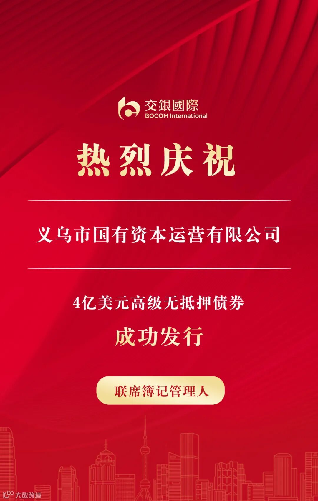 6月20日,交银国际作为联席簿记管理人协助义乌市国有资本运营有限公司(“义乌国资”)成功发行3年期4亿美元高级无抵押债券,票息5.70%。在联合承销团的建议下,发行人于6月20日向市场宣布以初始价格指导6.10%区间向市场打开簿记,交银国际积极与交行境内分行联动,协助公司夯实基石订单。在坚实基石订单支持下,最终成功定价发行4亿美元,较初始价格指导收窄40基点,创今年以来全国地方平台境外债券最大发行规模,同时这也是交银国际继2020年协助公司发行美元债以来,第三次参与公司的境外债发行工作,进一步深化了银企关系。