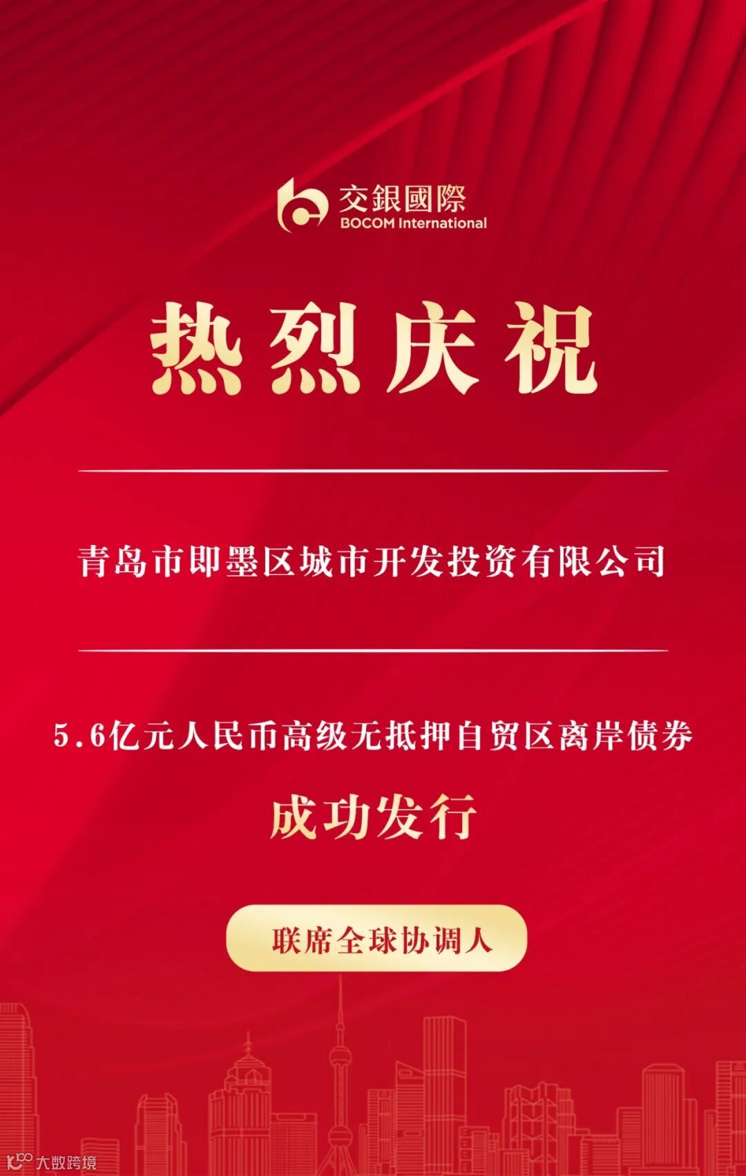 此次发行是交银国际继2019年参与公司美元债发行后,以全球协调人身份再次参与公司自贸区离岸债发行,双方进一步深化了合作。