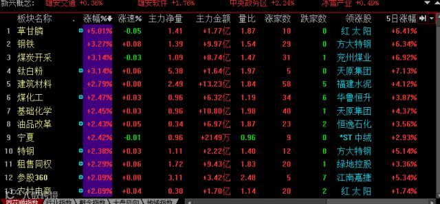 今日市场行业板块几乎全线上扬,其中以草甘膦、钢铁、煤炭、钛白粉等涨幅居前。高送转、机场航运、细胞免疫之类等有所回落。