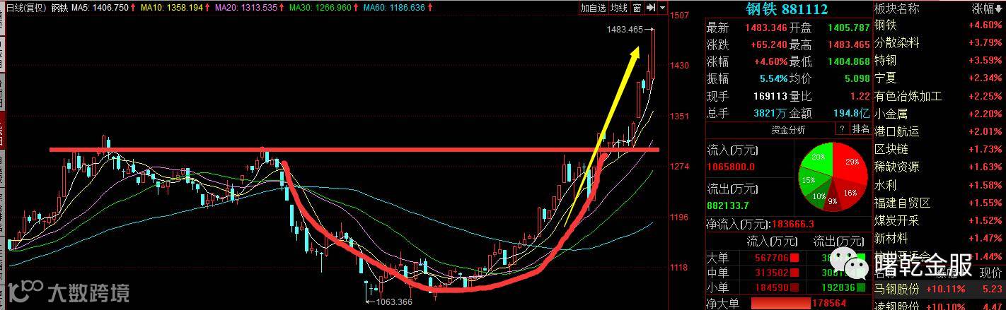 从钢板指数技术图表来看,经过前期一波长期圆弧筑底,上涨快速爆发,MA均线形成多头向上态势,指标偏强。