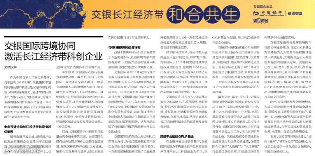 在金融开放加速的背景下,交银国际还致力于构建全资产类别跨境资产管理平台,以科创基金为抓手,以QFLP基金为创新,助力长江经济带科创企业成长。