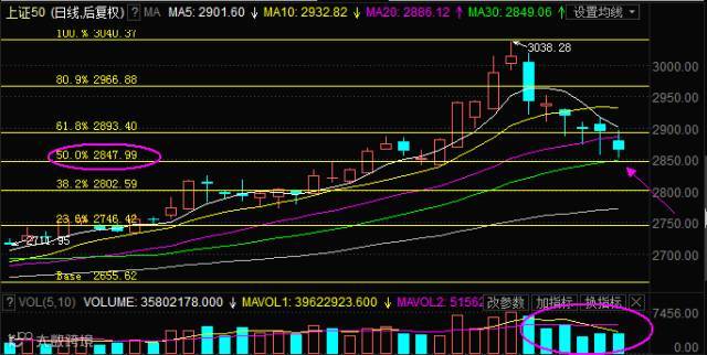 上证50指数从高位持续走跌,途中虽然日内总有反抽,但未能形成日线级别的反弹。如图黄金分割线所示,走势破位0.618直接杀到0.5这个半分位,一般这两个技术点位势必有一个产生反弹,在成交量持续萎缩之后,关注反弹的走出。