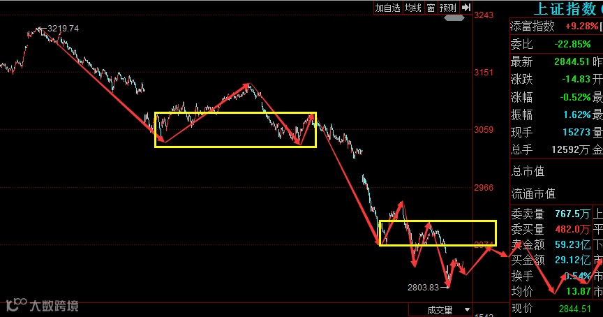 大盘从3219开始下跌,走势已经走出了趋势行情,今天大盘在新低后2800点附近获得支撑反弹,后面进行了二次回踩,五分钟级别走出了趋势背驰行情,下午的反弹就是背驰的反弹,从反弹的情况还没有走完,因此明天大盘预计还是有反弹的机会,反弹关注上方第一压力2858附近的缺口压力,第二压力2900点附近,突破失败再减仓,因为大盘肯定还有二次探底的,等二次探底构建了至少三十分钟的趋势背驰后就是真正的低吸机会。