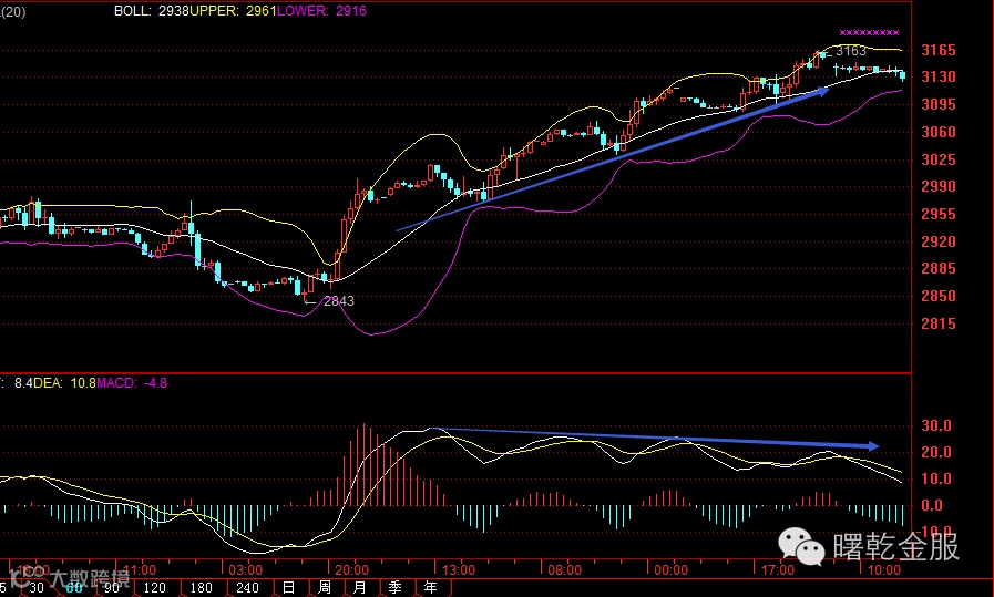 昨日收得一根带上下影线的小阳,收得4连阳,运行在布林上轨下方。从小周期看,1H-2H已经出现多头力竭的MACD连续多峰背离现象,若4H可出现背离现象,将形成小周期共振背离,其对价格的压制能力将大大增强,而顶背离行情的走出将概率大增。重点关注今晚公布的EIA原油库存数据表现!内部家人可联系分析师助理获取详细策略布局,具体的技术分析及策略操作可重点关注视频直播室。