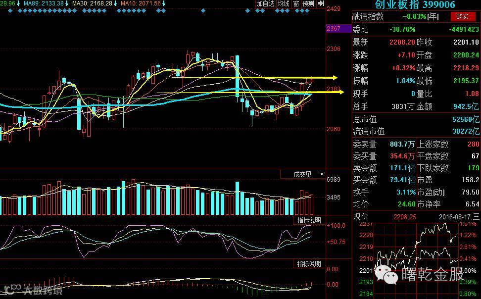 上证指数今日收阳十字星,上方依然受到年线压制,指数距离5日均线还有一定距离,日线KDJ高位钝化,即将打开钝化调整。60分钟的MACD和KDJ仍处于调整阶段,后期指数将继续震荡整理等待5日均线上移。创业板今日收小阳,日线MACD和KDJ走势良好,反弹动能继续存在,但是量能没有配合,导致反弹缺乏动力,指数后期容易再度回落。