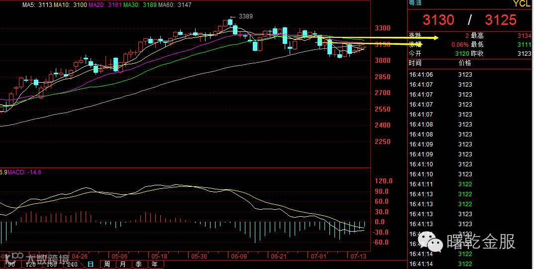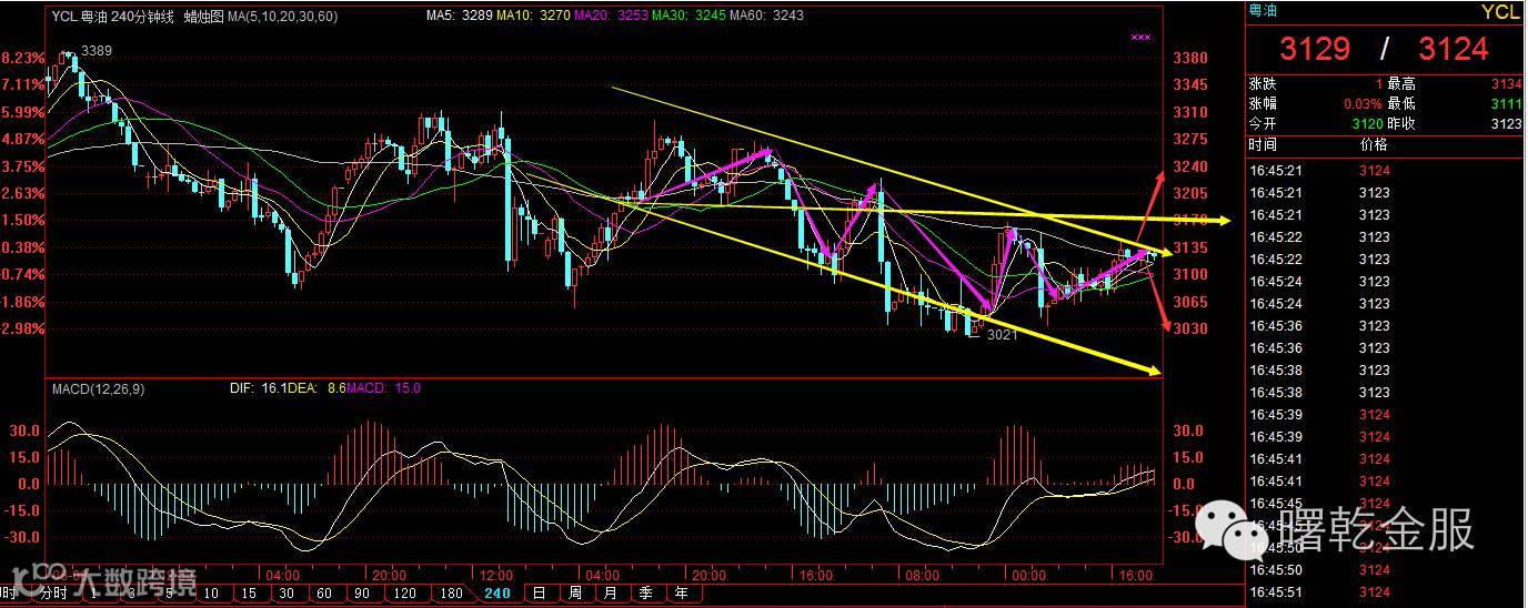 粤油今日在亚盘时间围绕均价线走窄幅区间震荡。从日线指标上看,连续2日收阳,短线表现出一定的抗跌情绪,周末土耳其政变从亚盘似乎并不买账,目前持续在3110-3130区间震荡,时间换空间。在1H图上看,MACD形成空头力量平缓,KDJ三线粘合平缓。在4H图上,价格现处于下降通道上方,上轨压力是3140附近,KDJ向下,而布林带上轨也是在3150附近。若欧盘无效企稳3150一带上方,行情继续回测试探日内新低。日内逢高做空较为稳健。详细的操作点位,联系助理免费获取具体操作策略。