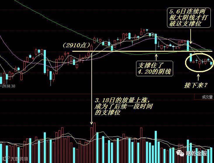 除此之外,我们再来看今年的走势。3月18日的放量上涨为4月20日的大跌提供了强支撑,此后在5月6日连续两根更强的阴线才将2910点支撑位打破。