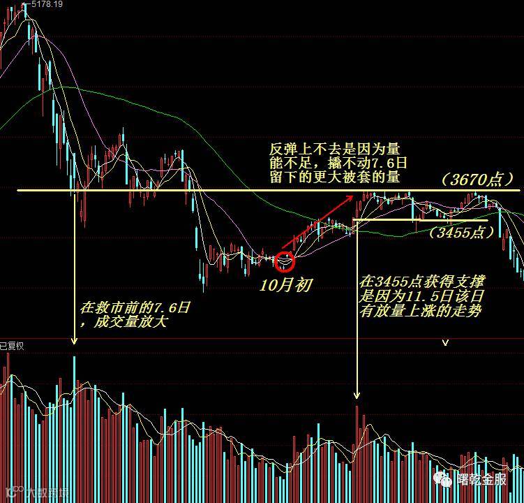从去年国庆结束之后反弹的行情来看,达到上涨顶部的3670点附近,我们往前看发现,这一点位正是国家队救市前7月6日的低位(当天成交量放大),而10月反弹的高点到这一点位时,并没有放大的成交量,说明反弹时的低量能并不能用较少的资金撬动7月6日留下来的套牢盘。