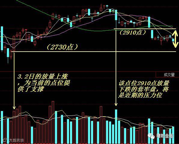 指数因为跌破了上一个支撑位,我们需要往前寻找放量上涨的位置,就是2730点,而上面的压力位是上一个放量下跌的点位2910点。所以通过这样的方法我们找到了支撑位,压力位分别为2730点,2910点。