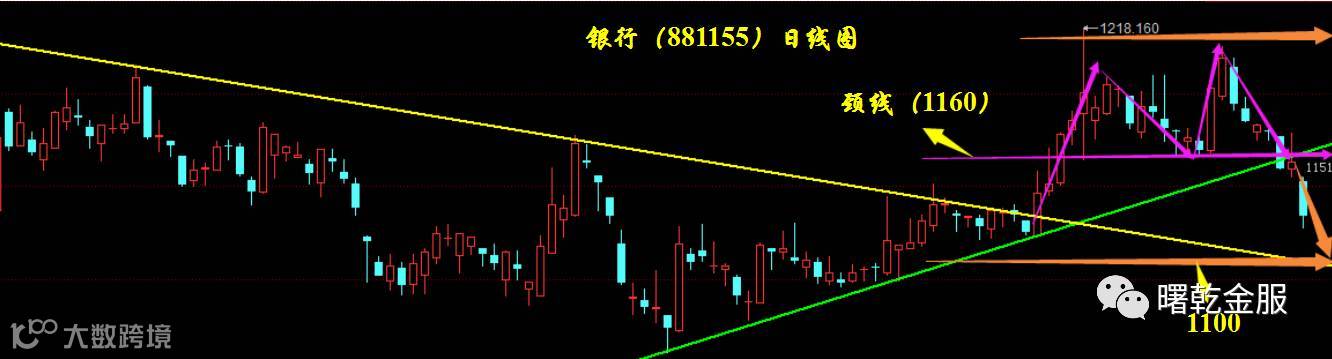 银行指数M字头走势确立,目前走日线级别调整。由于颈线(1160点)被跌破,根据等距,指数理论下跌目标是1100点。