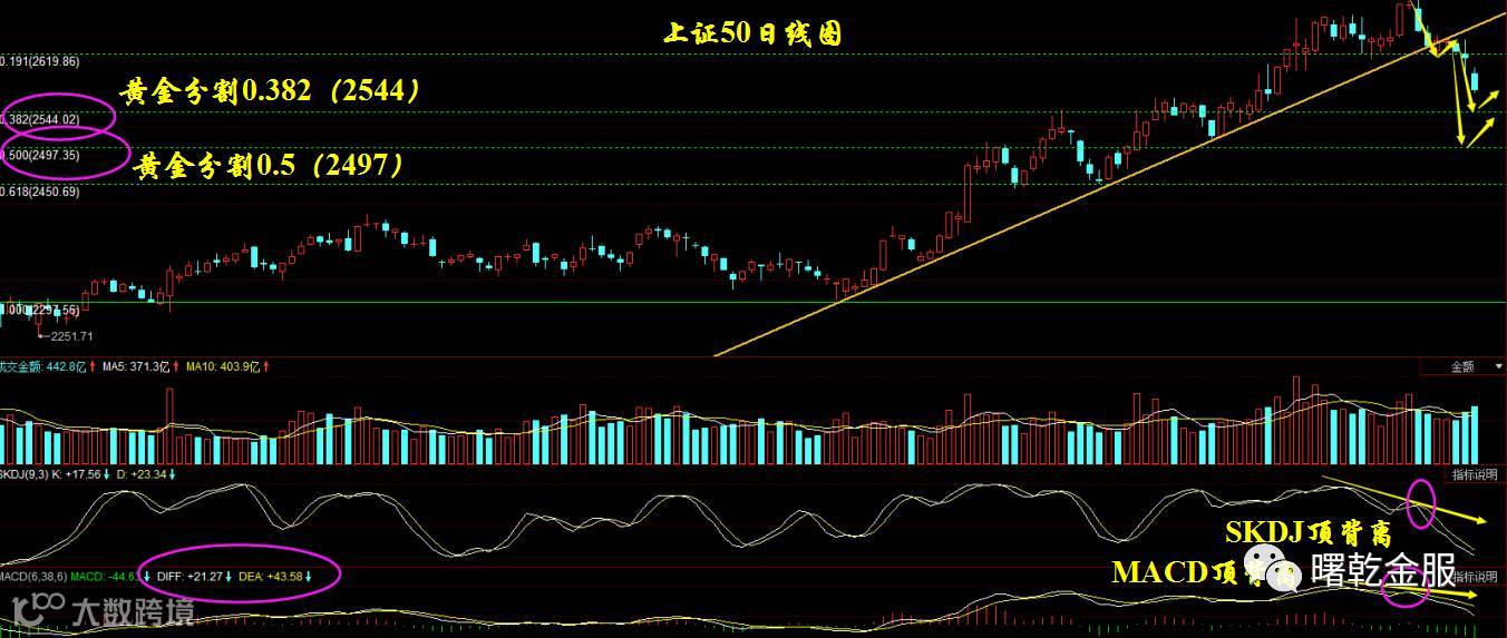 根据黄金分割比例,2297-2696点的黄金分割0.382是2544点,黄金分割0.5是2469点,目前指数暂没止跌。