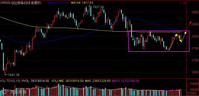 创业板的走势符合我们昨天的预期,整体安全边际较高。今天下探之后形成日内反转,并且有成交量的配合,后市关注个股轮动后,小盘股的延续性如何。研判的重点已经反复强调过的 ,即图中箱体的上轨1817,这个点位目前还是60日线与144日线所在。