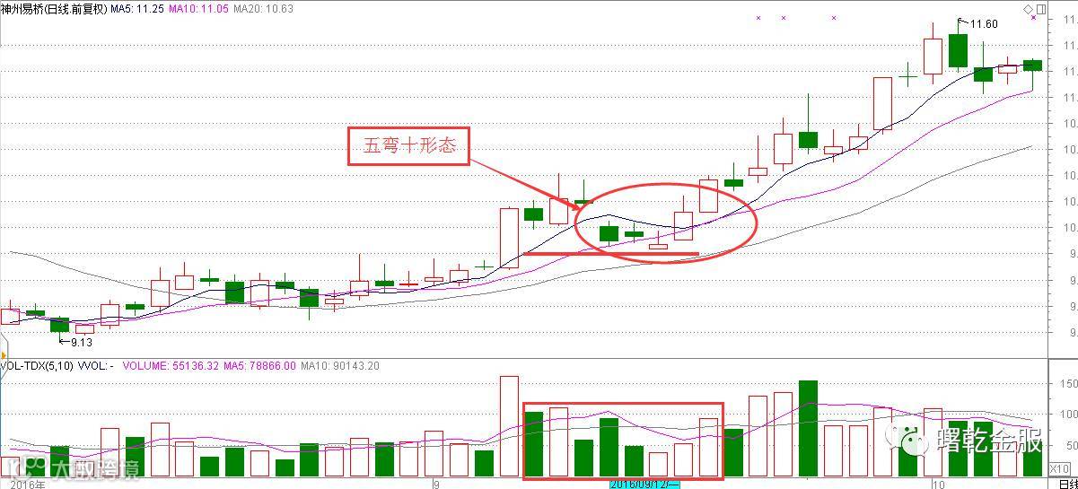 五弯十形态即五日均线弯至十日均线,并不是下破十日均线,因为在做形态期间,常有日K线里五日均线接近下穿十日均线的时候对此就会以为形态走坏了不去理它,却不知这是一种骗线行为,其实五弯十形态本身就存在这种欺骗性,不使用一些反常手段怎么能将获利筹码震出来主力随后还怎么赚大钱。