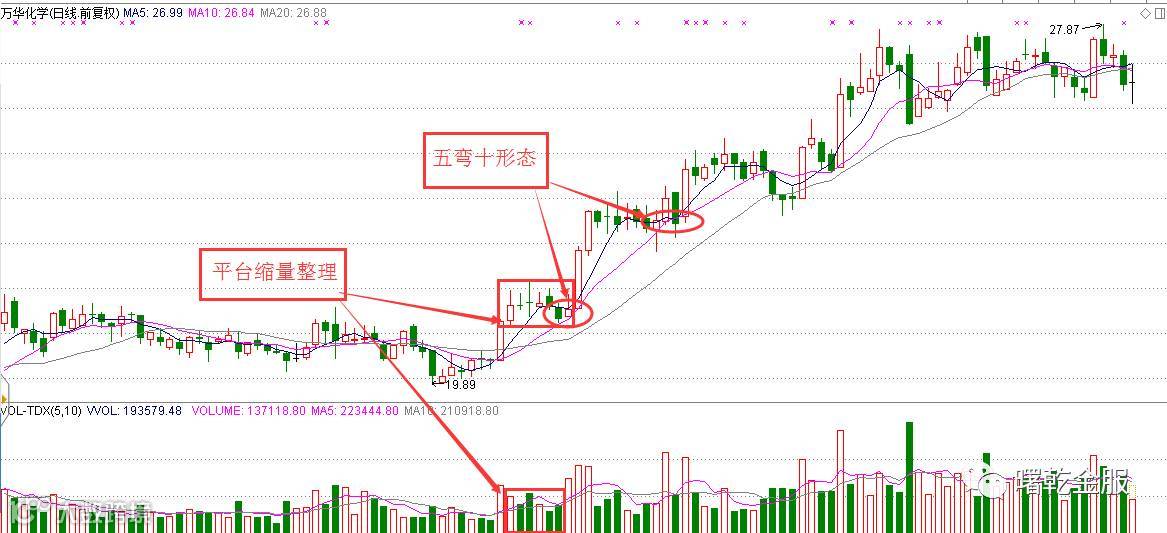 万华化学底部启动后做了个平台整理,之后形成五弯十形态再次放量上攻,连续拉升过后做了个长期整理又形成五弯十形态后向上拉升。