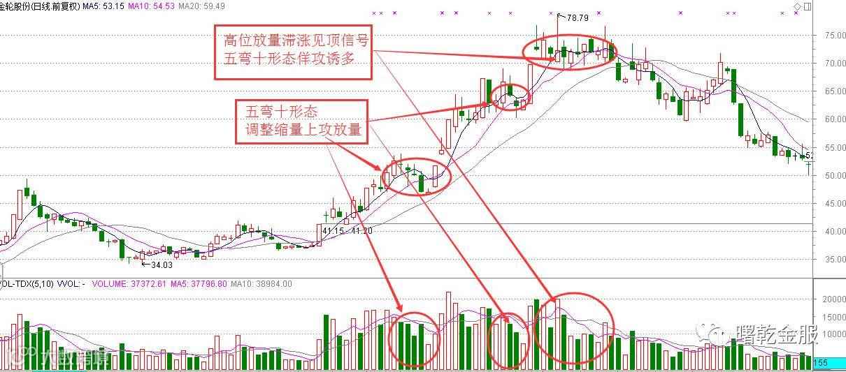 金轮股份最后出现的五弯十形态就要起戒心了,前面放量涨停第二天冲高回落,随后出现放量滞涨,形成了涨幅过大后的顶部形态,随后在出现五弯十形态的时候量能又跟不上了,明显的诱多信号。所以在选择大形态关注的时候,回收前期走势,注意前高点头部形态也是非常必要的。