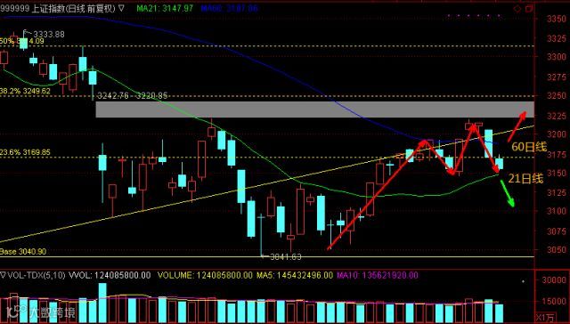 大盘近期受到权重股低迷的拖累,突破60日线之后没能企稳,反而在昨天跌回60日线之下,今天延续下跌势头再度收阴,不过成交量有所萎缩。短线走势明天关注下方21日均线3147的得失,这里还是上周五上涨阳线的起点,有较强的支撑。如果能在该线止跌,那么后市将再次上攻,并至少走向图中的黄金分割0.382所在3250一线,而如果被跌破,则还将继续下探。