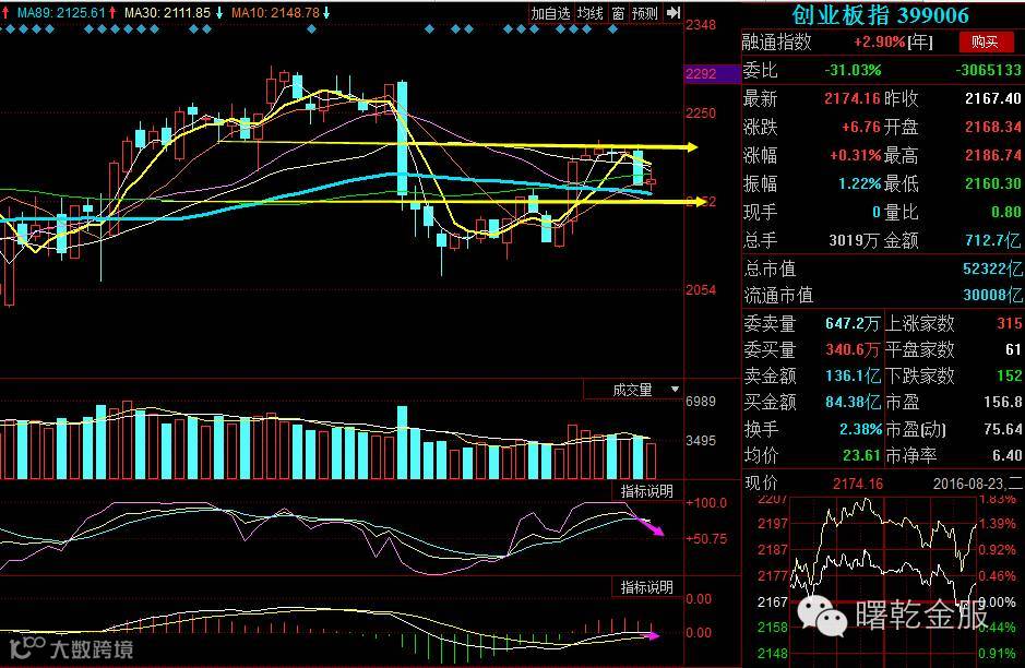 上证指数目前处于尴尬的境地,上有5日均线压制,下方有10日均线支撑。日线MACD和KDJ依然没有走好,指数在1H图的下降通道没有被打破,这些都导致大盘走得非常纠结。创业板受到5日和30日均线合力的的压制,KDJ指标死叉向下,小级别指标均在低位运行。指数虽然有企稳的迹象,但是由于做多动能缺乏,2200点整数关口依然是重压,大趋势弱势特征一览无遗。