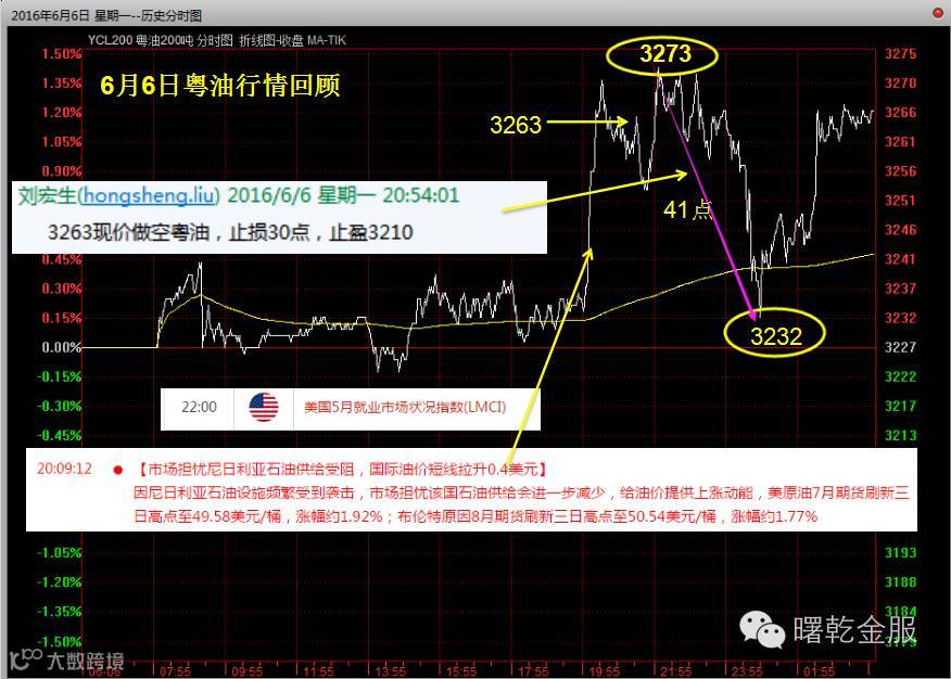 昨日6月6日(周一)粤油市场开市后高走缓慢震荡下行,到夜间北京时间8点左右尼日利亚受到恐怖分子的袭击,导致了粤油在短时间内急速上涨,大涨46个点,至3275高点,紧接着受上方压力位的3280的影响,又跌至3235前期大涨的点位,最终报收3266,形成了一根小阳线,由此可见,粤油市场的库存在这次EIA的数据公布的情况会不断减少,粤油将继续上涨,重点关注明日凌晨4点30分的API原油库存情况。
