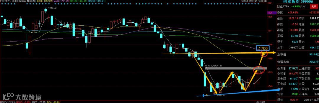 创业板今天上午是走得“上串下跳,来回摇摆”,这是市场犹豫不决的一个信号,昨天创业板收出一根大阳,今天正好来到30日线位置,改编一下莎士比亚的名句就是——“冲击与不冲击?这是一个问题!”,一旦冲击成功,创业板大概率要去探一下1700点,那万一冲击不成功呢?那就是回踩,回踩位置就是5日线(即1593点)。