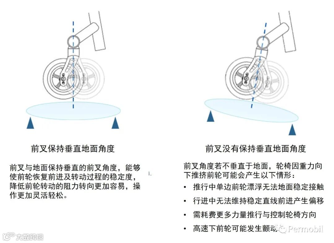 轮椅的适配应当是四维的,除了轮椅出厂设定的三维状态,也要考虑“时间”带给轮椅的影响。钛合金车架的长疲劳极限,为他带来了经年累月使用不易变形产生旷量、异响和推行能量损失的特性,辅以轮椅必要的可调整度才能更好地在多年的时间里更好地适配使用者可能变化的需求。我们鼓励量身定制手动轮椅在适配过程中,为使用者保留且仅保留必要的可调整性(关于“必要的可调整性”:比如对于大部分成年手动轮椅使用者而言座宽坐深的可调整性便可以被视为是一种“非必要”的可调整性,因为为这些参数可调牺牲的推行品质是“可调”的收益弥补不回来的。两害相较取其轻,我们建议使用者不必执着类似非必要的可调整度)。对于可调节部分,调节能否精准,牢固,对称,搭配恰当便是其重中之重了。手动轮椅尺寸适配牵一发而动全身。例如当我们调整了轮椅的前后坐高之后,前叉与地面的角度便会发生如下的变化和影响: