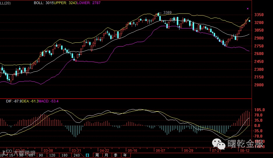 目前指数要想有进一步的表现,最大的问题还是在日K线上的年线压力。其实自去年股灾以来,指数原则在年线下方运行,此次再度逼近年线,并不是主动上攻的结果,而是年线逐步下移压迫指数的结果。说明目前的市场的属性仍然是偏弱的特质。按照近期市场的成交量能和市场情绪来看,要想形成突破还是有一定的难度。如果指数知难而退,周K线上120周均线在3095的支撑又至关重要,该支撑今日宣告跌破,行情也不会太乐观。在3100-3095点上下空间不断压缩的前提下,大盘更多可能选择向下寻求支撑。
