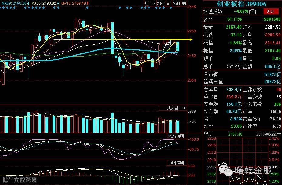 上证指数今日收光脚阴线,生吞了前期小阴小阳的横盘格局,加上年线的无情压制,让市场走势显得难看。上周一大阳线的成果已经跌去大半,不仅3100点失守,距离10日均线也仅一步之遥。随着市场波动加剧,下方3050点平台位置更加关键,因为这一位置既是前期重要平台位,又刚好存在一个跳空缺口,指数若继续下探,这一双重支撑位或成为调整第一目标位。而创业板收出光头中阴,前期大阴一半位置多次上攻无力,今日更跌破多条重要均线支撑,KDJ形成高位死叉,弱势显然而见,大概率重回箱体下沿2100点附近位置。
