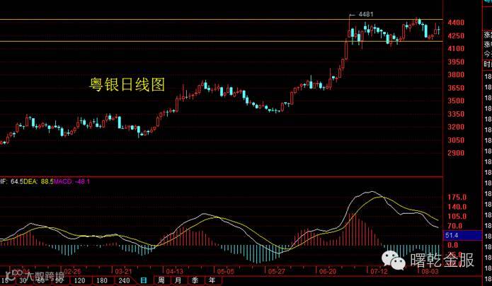 粤银日线图分析,行情走势在高位整形整理,区间4180-4450,,MACD指标继续在0轴上方高位死叉,目前下方支撑4250,晚间的初请失业金人数会给行情走势带来较大的波动,大家可耐心的等待数据的情况,内部家人可联系分析师助理获取详细策略布局,具体的技术分析及策略操作可重点关注视频直播室。