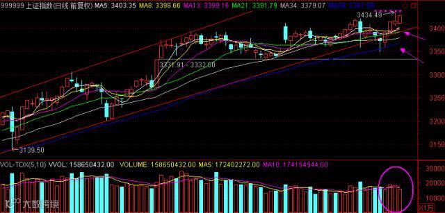 原本预期,指数在“倒锤子线”之后,多会回调去确认下短期均线,今日走势比预想中还强,窄幅震荡调整后尾盘走高,并站上了前高3421,收“光头”阳线,走势延续性较好。