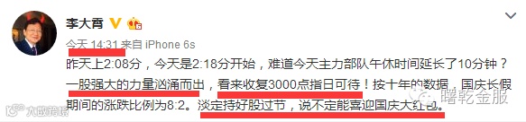 李大霄老师的独门绝技---“十看九不准”今天再次印证了自己的威力。要论看盘的功夫,笔者只服李大霄老师!真是“跟着大校走,跌破两千九”啊!