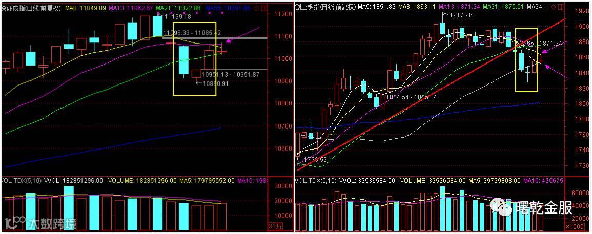 创业板与深指本周都形成了“启明星”的K线组合,今天延续反弹上攻8日线,最终冲高回落,皆收出“流星线”,短线还有反复上探的预期。