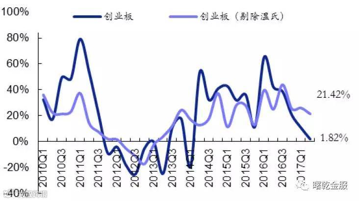 创业板整体单季度净利润增速在2016年第1季度达到最高值62.9%后已经连续5个季度出现下滑,下滑幅度高达58%。