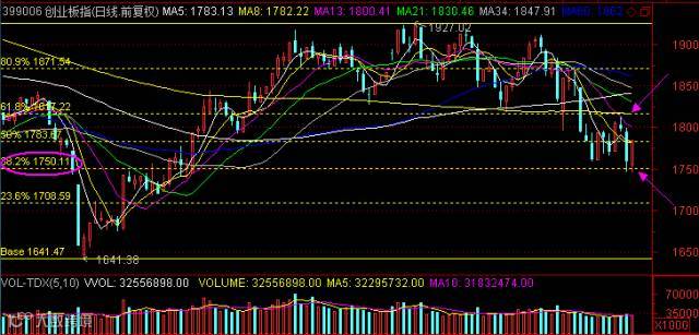 创业板在之前的分析已经指出,由于市场较弱,已经不单单从时间维度进行深幅回调,而且从空间的维度也是如此。深幅回调的基本点位就是图中黄金分割0.382所在1750。