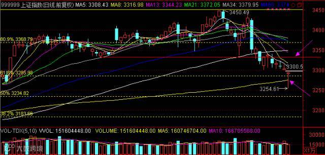 指数今天一度连破几个重要的点位——整数关口3300、黄金分割0.618处3285与144日线3275,不过尾盘收回后面两个点位,形成单针探底的“锤子线”,成交量相对昨日大幅缩减。
