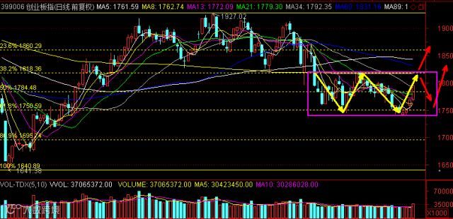 创业板之前分析大方向时说明了,进入到黄金分割0.618所在1750之下,安全边际较高。上周跌破后收回,重新拿下短期均线,今天补涨收出放量大阳线,有上攻箱体上轨1817的节奏。