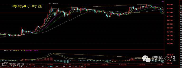粤银日线图分析,价格与MACD呈现顶背离形态,短期均线向下交叉,MACD在高位形成二次死叉,4小时分析均线系统呈现空头排列,价格位于短期均线下方,MACD在0轴下方运行,绿色能量柱继续放大,但下方支撑位强盛,在操作的过程中尽量以高空为主,内部家人可联系分析师助理获取详细策略布局,具体的技术分析及策略操作可重点关注视频直播室。