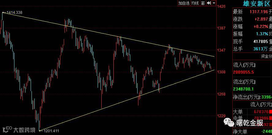 雄安新区30分钟图,从走势看,目前已经进入关键的变盘时刻,三角形收敛形态即将结束,往上还是往下,将决定该板块个股的去留!