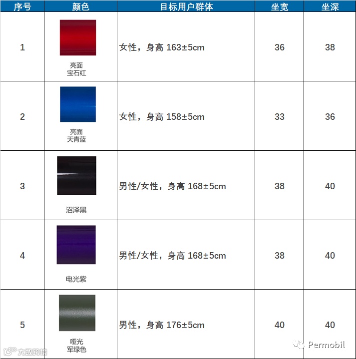 首批将有五台轮椅进行试点体验,供体验的TiLite颜色及坐宽坐深尺寸如下: