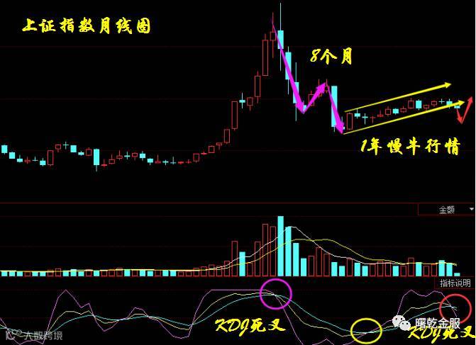 技术分析是讲究时间周期的对称性,就这个月线的KDJ死叉来看,由于走了整整1年的慢牛行情,所以月线的指标都是在高位,高位的KDJ月线死叉杀伤力是无比巨大的!