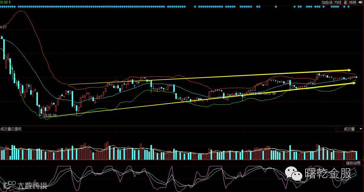 从布林带指标上看,上证指数在中轨附近窄幅弱势震荡已经2周,即将变盘向下轨靠拢,KD、RSI等指标已经发出变盘预警。由于这个楔形的时机跨度大,上升斜率小,后市一旦向下变盘突破,其杀伤力不可小视。